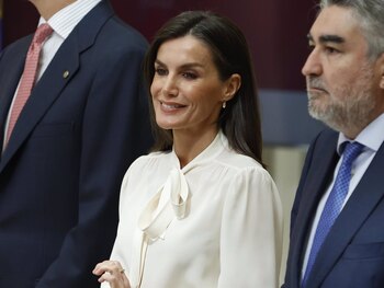 Nuevo compromiso para los Reyes Felipe y Letizia, que tras desplazarse a Cádiz este miércoles para entregar las Medallas de Oro al Mérito de las Bellas Artes a artistas de la talla de Víctor Manuel, Concha Buika, Carme Elías o María Jiménez -a título póstumo- han presidido esta mañana en el Palacio Real de El Pardo los Premios Nacionales del Deporte 2022. Unos galardones con los que el Consejo Superior de Deporte (CSD) reconoce a las personas y organizaciones que han contribuido de forma destacada a impulsar o difundir la actividad físico-deportiva en nuestro país en el último año. Entre los premiados, rostros tan populares como el tenista Carlos Alcaraz, la campeona paralímpica de triatlón adaptado, Susana Rodríguez, o el joven jugador de baloncesto Izan Almansa.?? Un acto en el que Doña Letizia ha apostado por un look de corte ejecutivo combinando dos de las prendas más 'amortizadas' de su vestidor, a las que ha dado una nueva vida (y ya hemos perdido la cuenta). Si ayer en Cádiz deslumbró recuperando el vestido estampado de invitada en rosa y blanco de Lady Pipa que tanto ha gustado desde que lo estrenó en abril de 2023, hoy se ha decantado por un estilismo más sencillo que nos ha conquistado por favorecedor, cómodo y perfecto para cualquier ocasión. Su Majestad ha escogido su color fetiche en los actos relacionados con el deporte, el rojo, reciclando el cañero pantalón de cuero de Hugo Boss en este color que le vimos por primera vez en noviembre de 2022 y se ha convetido en uno de sus 'comodines'. Un diseño tobillero de cintura alta y corte recto que potencia su figura, que ha combinado con un cinturón de piel en blanco con hebilla dorada y la blusa más romántica y versátil de su colección. Un sofisticado modelo con maxi lazada al cuello, drapeados y mangas largas abullonadas de Carolina Herrera que estrenó en 2017 y ha llevado tanto en actos de gala como en otros de corte más informal, combinándola con falda midi, falda larga o pantalón y demostrando que es un fondo de armario que todas deberíamos tener. En cuanto a los complementos, la Reina sigue apostando por los tacones sensatos por el neuroma de Morton que sufre en los pies y ha estrenado unos zapatos de tacon kitten de piel en el mismo rojo que el pantalón. Con su media melena suelta y presumiendo de canas, Doña Letizia ha completado su look con unos pendientes de oro en forma de lágrima y su inseparable anillo de Coreterno.