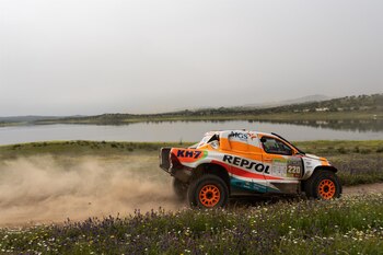 El piloto español Isidre Esteve (Repsol Toyota Team) ocupó este sábado el decimotercer puesto de la categoría Ultimate, con coches 4x4 de última hornada, en la cuarta etapa del Rally Raid de Portugal, disputada sobre 253 kilómetros entre Badajoz y el municipio de Grândola. En los alrededores de Villafranca de los Barros, Jerez de los Caballeros y Fregenal de la Sierra, varios tramos rápidos y técnicos de los primeros 100 km cambiaron un panorama donde en los días previos se habían visto sobre todo las estrechas y embarradas pistas portuguesas. No obstante, las balsas de agua volvieron a aparecer en la segunda parte de la jornada, más lenta y sobre un terreno más roto, con piedras y zonas de bosque. El piloto ilerdense y su copiloto, Txema Villalobos, ofrecieron una gran versión para disfrutar del público abarrotado en las cunetas y subir hasta la novena posición en la tabla general de Ultimate. "Me he divertido muchísimo, la verdad. La especial no tenía nada que ver con las que hemos disputado en Portugal estos días atrás. Era muy técnica de principio a fin, exigía un pilotaje preciso, contaba con tierra, pistas rápidas, con algún paso de agua... Fantástica. Me ha gustado muchísimo. Estamos supercontentos con el ritmo que estamos demostrando, con los parciales que hemos marcado y con nuestra posición antes de la última etapa del rally", declaró Esteve al Repsol Toyota Team. "Una de las cosas que más ilusión me han hecho ha sido ver a tantísima gente entregada siguiéndonos en el tramo. Me encanta que la afición española tenga la opción de ver de cerca una prueba del Mundial de rally raid y poder compartir con ellos momentos como los de anoche en la asistencia de Badajoz", añadió el piloto ilerdense. "He disfrutado mucho estos dos días; ha sido una experiencia fantástica. Por si fuera poco, este rally me está permitiendo trabajar con los ingenieros de Repsol para evolucionar el combustible renovable con el que ya competimos en los dos últimos Rally Dakar. Todos los aprendizajes que estamos obteniendo buscan seguir mejorando nuestras prestaciones en el futuro", concluyó Esteve.