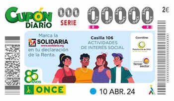 El cupón de la ONCE de este miércoles, 10 de abril, estará dedicado a la casilla de 'Actividades de Interés Social' de la Declaración de la Renta, la conocida 'X Solidaria'. Serán cinco millones de cupones los que lleven por toda España el mensaje de que con este "simple gesto se beneficia a millones de personas". Marcar la 'X Solidaria' sirve para destinar un porcentaje de su cuota íntegra a realizar programas de ayudas para personas mayores, personas con discapacidad, inmigrantes, o jóvenes y mujeres en riesgo de exclusión. Al marcar la 'X Solidaria' se destina un 0,7 % de los impuestos a programas que realizan las ONG, y que benefician a las personas en situación de vulnerabilidad; sin ningún coste económico para quien la marque. La Plataforma de ONG de Acción Social coordina desde el año 2002 la campaña X Solidaria. Desde ese año, casi cinco millones de personas más marcan la casilla solidaria de la Renta pasando de 6.887.500 declarantes en 2002 a 11.733.662 en 2022. Además, la recaudación se ha incrementado en 154 millones de euros entre 2012 y 2022. Esta campaña cuenta con el apoyo de la Plataforma del Tercer Sector, la Plataforma del Voluntariado de España, la Red Europea de Lucha contra la Pobreza y la Exclusión Social en el Estado Español (EAPN-ES), el Comité Español de Representantes de Personas con Discapacidad (CERMI), la Plataforma de Organizaciones de Infancia y la Coordinadora de Organizaciones para el Desarrollo.