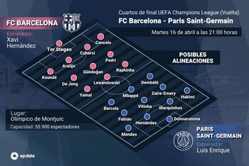 En el siguiente enlace podrás consultar el cuadro, las posibles alineaciones y las estadísticas previas de la vuelta de los cuartos de final de la UEFA Champions League 2023-24: https://www.epdata.es/datos/final-uefa-champions-league-temporada-datos-graficos-resultados-estadisticas-cuadro-grupos-cruces-sorteo-historicas-ranking-jornada-jugadores-entrenadores-equipos-real-madrid-barcelona/692 Para cualquier duda o información adicional, contactar con EpData: contacto@epdata.es