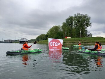 Según informó el propio colectivo en un comunicado, los activistas sujetaron desde sus barcas una pancarta con el eslogan "Stop - cerrado por catástrofe climática", impidiendo el paso por el canal que conecta el puerto con el río Rin.