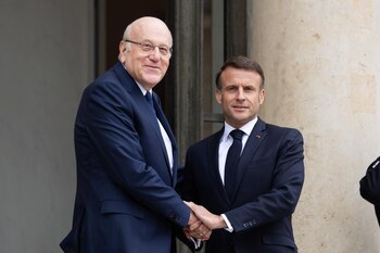 El presidente francés, Emmanuel Macron, ha recibido este viernes en París al primer ministro de Líbano, Nayib Mikati, y al jefe de Estado Mayor de las Fuerzas Armadas, Joseph Aoun, para expresar su apoyo a Beirut en plena escalada en Oriente Próximo por los ataques de Israel contra Irán. "El presidente de la República reafirmó el compromiso de Francia de hacer todo lo que esté a su alcance para impedir el aumento de la violencia entre Líbano e Israel, de conformidad con la resolución 1701 del Consejo de Seguridad de Naciones Unidas", ha indicado en un comunicado el Elíseo. Asimismo, Macron "ha recordado el compromiso de Francia" con la misión de paz de la ONU en Líbano (FINUL), encabezada por el comandante español Aroldo Lázaro, así como la "responsabilidad" que tienen todos los actores para que pueda "ejercer plenamente" sus actividades en el país. De la misma forma, ha expresado "su determinación de seguir proporcionando a las Fuerzas Armadas libanesas el apoyo que necesitan". Macron también ha hablado por teléfono con el presidente del Parlamento libanés, Nabih Berri, y ha pedido a los líderes políticos "que encuentren por fin una salida a la crisis institucional que debilita a Líbano". Esto se produce tras seis meses de enfrentamiento entre Hezbolá e Israel en la frontera común a propósito de la ofensiva lanzada por el Ejército israelí tras los ataques de las milicias palestinas el pasado 7 de octubre, que se saldaron con 1.200 muertos y 240 rehenes. El balance de palestinos muertos a causa de la ofensiva desencadenada por Israel contra la Franja de Gaza tras los ataques del 7 de octubre por el Movimiento de Resistencia Islámica (Hamás) ha superado la barrera de los 34.000, según han denunciado este viernes las autoridades gazatíes, controladas por el grupo islamista.