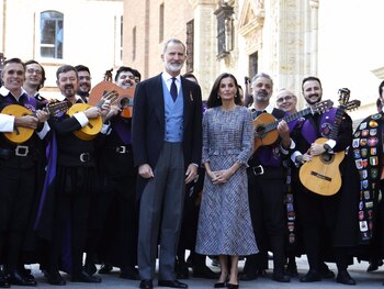 La Reina Letizia y el Rey Felipe VI han reaparecido este martes 23 de abril para entregar el Premio de Literatura 'Miguel de Cervantes 2023', que en esta edición ha ganado el escritor español Luis Mateo Díez por ser "uno de los grandes narradores de la lengua castellana, heredero del espíritu cervantino, creador de mundos y territorios imaginarios". A la salida del evento, tanto Don Felipe como Doña Letizia han sido recibidos con un fervoroso baño de masas. El bullicio y la emoción se han desatado en la Universidad de Alcalá, donde los monarcas se encontraban acompañados de diferentes personalidades, entre los que se encontraban al Presidente del Gobierno, Pedro Sánchez, la Presidenta de la Comunidad de Madrid, Isabel Díaz-Ayuso, y el Presidente de Castilla y León, entre otros. Mientras disfrutaban del espectáculo de la tuna, los Reyes observaban con entusiasmo los cánticos, conversando animadamente entre ellos y sonriendo. Una ocasión en la que incluso algunos ciudadanos presentes se animaron a unirse a los tuneros en sus canciones. Una vez concluido el espectáculo, ambos se han acercado a saludar entre vítores y muestras de cariño, con cánticos de "¡Vivan los Reyes!", "¡Felipe, grande!" y "¡Viva Letizia!". La Reina demostró una vez más su cercanía al público, interactuando con los presentes, quienes no dudaron en elogiar su elegancia y enviar saludos a sus hijas. En respuesta, Doña Letizia ha agradecido con un cálido "gracias". Un evento que destaca una vez más la cercanía y el carisma de los Reyes de España, quienes han recibido multitud de muestras de afecto y apoyo por parte de los asistentes.