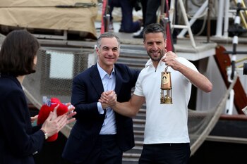 El presidente del Comité Organizador París 2024, Toni Estanguet, fue quien entregó el fuego sagrado a la delegación francesa encargada de portarla en el emblemático barco.