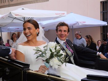 El barrio de Triana se ha engalanado para albergar la celebración del enlace de Joaquín Astolfi Espinosa, sobrino de Luis Astolfi, y Alba Valenzuela. La pareja se ha dado el 'sí, quiero' a las seis y media de la tarde en la parroquia de Nuestra Señora de Santa Ana en un multitudinario enlace al que no ha faltado el mítico jinete hispalense, gran amigo de la infanta Elena. El novio llegaba minutos antes de la hora señalada acompañado de su madre y madrina, Llanos Espinosa Cobo, que siguiendo el protocolo lucía la tradicional mantilla que le daba el toque andaluz al elegante y sencillo traje dos piezas escogido para la ocasión. Ambos han posado sonrientes a la puerta del Templo, protagonizando una tierna imagen entre madre e hijo. Joaquín, a quien su madre miraba embelesada, no podía disimular su nerviosismo antes de pasar por el altar. Joaquín y su madre, a los que se ha unido su marido, Joaquín Astolfi Pérez de Guzmán, han recibido a los numerosos invitados, entre los que se encontraba Hubertus de Hohenlohe, que ha acudido acompañado de su mujer, Simona Gandolfi. "Amigos de Marbella de toda la vida", Hubertus no ha querido faltar a la celebración de la boda que ha definido como "de amor y tan feliz". Luis Astolfi no ha faltado a la boda de su sobrino carnal, el primero de los tres hijos de Joaquín en contraer matrimonio. La gran ausente ha sido Tita Astolfi, prima carnal del novio, y una de las mujeres de la alta sociedad sevillana con más solera. Embarazada de su segundo hijo, Tita también faltó a la Feria de Sevilla, aunque recientemente se dejaba ver en el Salón Gourmets celebrado en Madrid, acompañando al Presidente del PP, Alberto Núñez Feijóo.