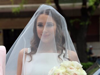 Eugenia Gil y Javier García-Obregón se han dado el 'Sí, quiero' este 1 de mayo en la iglesia de San Fermín de los Navarros, ubicada en Madrid. Un enlace matrimonial en el que ha reinado el caos debido al retraso de cuarenta minutos de la novia... pero que ha terminado por todo lo alto. Al más puro estilo de Marilyn Monroe con su icónico vestido rosa fucsia que lució en 'Los caballeros las prefieren rubias', la novia ha aparecido con un traje similar al de la artista. Eso sí, ha cambiado el escote y, por supuesto, el color del traje. Respetando el 'protocolo' que hay en las bodas que se celebran en la iglesia, Eugenia ha confiado en la firma Anmargo para el día más importante de su vida. Un vestido que ha recordado al de la actriz anteriormente mencionada, ¿por qué? Aunque el escote del vestido de Eugenia no tiene nada que ver con el que lució Marilyn, la lazada XXL que caía a modo de cola en la parte trasera del traje y los guantes altos nos recordaban al icónico fucsia. En cuanto al escote, la novia ha apostado por uno halter y los hombros descubiertos. Además, ha lucido un velo corto y casi transparente y portaba en sus manos un ramo de peonías blancas.