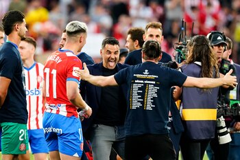 Girona, 4 may (EFE).- El Girona celebró su histórica clasificación para la Liga de Campeones sobre el césped de Montilivi y justo después de la victoria con remontada de este sábado ante el Barcelona por 4-2 en el derbi catalán de la 34ª jornada de LaLiga EA Sports.
