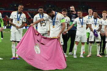 El capitán emocionado miró sonriente el trofeo, hizo gestos dirigidos a sus familiares y se encaminó al encuentro con el resto de sus compañeros. Escoltado por Carlo Ancelotti, alzó la copa de campeón mientras se disparó el confeti de color blanco madridista.