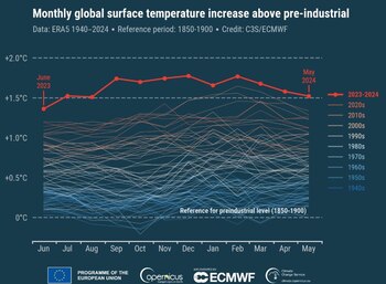 Mayo de 2024 fue el mayo más cálido registrado a nivel mundial, con una temperatura media global del aire en superficie 0,65 grados Celsius superior a la media del período 1991-2020. Este dato marca el duodécimo mes consecutivo en el que la temperatura media global alcanza un valor récord para el mes correspondiente, según los datos publicados este 5 de junio por el Servicio de Cambio Climático de Copernicus (C3S), financiado por la Comisión Europea. Los datos de Copernicus para mayo muestran que la temperatura media global de mayo de 2024 fue 1,52 °C superior a la media preindustrial de 1850-1900, lo que marca el undécimo mes consecutivo (desde julio de 2023) con una temperatura igual o superior a 1,5 °C. La temperatura media mundial de los últimos 12 meses (junio de 2023 – mayo de 2024) es la más alta registrada, 0,75 °C por encima del promedio de 1991-2020 y 1,63 °C por encima del promedio preindustrial de 1850-1900. AL MENOS UNO DE LOS CINCO PRÓXIMOS AÑOS BATIRÁ EL RÉCORD DE 2023 La racha de 12 meses se confirma al mismo tiempo que la Organización Meteorológica Mundial (OMM) y la Oficina Meteorológica del Reino Unido publican su Actualización de Predicciones Climáticas Anuales a Decenales, que sintetiza las predicciones anuales a decenales realizadas por estas instituciones para el futuro cercano para el período 2024-2028. Este informe muestra, entre otras muchas conclusiones, que es probable que al menos uno de los próximos cinco años sea el más cálido registrado, superando a 2023. Carlo Buontempo, director del C3S, declaró en un comunicado: “Es impactante, pero no sorprendente, que hayamos alcanzado esta racha de 12 meses. Si bien esta secuencia de meses récord se interrumpirá eventualmente, la firma general del cambio climático permanece y no hay señales a la vista de un cambio en esa tendencia”. “Vivimos tiempos sin precedentes, pero también tenemos una habilidad sin precedentes para monitorear el clima y esto puede ayudar a orientar nuestras acciones. Esta serie de meses más cálidos se recordará como comparativamente fríos, pero si logramos estabilizar las concentraciones de gases de efecto invernadero en la atmósfera en un futuro muy cercano, podríamos volver a estas temperaturas “frías” a fines de siglo”.