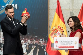 El Real Madrid de baloncesto celebró este jueves la consecución de la Liga Endesa con las recepciones de la presidenta de la Comunidad de Madrid, Isabel Díaz Ayuso, y del alcalde, José Luis Martínez-Almeida, quienes reconocieron a un "equipazo" con "porte y elegancia", que compite "contra la historia" del propio club. Después del triunfo en Murcia el miércoles, el Madrid alzó su 37ª Liga y el tercer título de esta campaña, que ofrecieron en las instituciones madrileñas y a los cientos de aficionados reunidos sobre todo en la Puerta del Sol. La Real Casa de Correos, sede de la Comunidad de Madrid, fue la primera parada de los campeones. El primero en tomar la palabra fue el capitán Sergio Llull, dando "gracias a todos", también a los que "no meten canastas" pero "igual de importantes". "Ha sido una temporada muy larga, muy dura, pero es un motivo muy grande de alegría acabar consiguiendo la Liga. Estamos muy orgullosos del trabajo que hemos hecho. Ojalá el año que viene podamos volver con más títulos", afirmó. Después del '23', Florentino Pérez inició su discurso agradeciendo a Díaz-Ayuso el homenaje de la Comunidad, destacando el trabajo de la sección de baloncesto del conjunto blanco y dando gracias a "equipo y afición". "Ha vuelto a ser una gran temporada para el Real Madrid de baloncesto, con tres nuevos títulos, un equipo legendario, siendo fieles a los valores del Real Madrid. Este equipo ha superado un récord del club, con 72 victorias de 86 partidos. Han sabido sufrir y han vuelto a provocar la admiración de todos los que aman al baloncesto", dijo. "Quiero transmitiros el orgullo de todos los madridistas por haber formado una gran familia que siente esta camiseta con pasión. Habéis hecho unos 'playoffs' perfectos. Chus Mateo, cinco títulos, todos los posibles, un hombre de la casa que representa lo que es el Real Madrid", añadió Florentino, elogiando también de modo particular a Sergio Llull, hombre récord del club con 1083 partidos, y al MVP de las finales Dzanan Musa. Por otro, el presidente del Madrid hizo mención especial a Rudy Fernández, quien se despide del conjunto blanco. "Gracias por 13 temporadas, más allá de tus 26 títulos, un comportamiento ejemplar dentro y fuera de las canchas. Con una ovación histórica en el WiZink Center, quince minutos de aplausos donde está el reconocimiento a una trayectoria impecable", dijo. Mientras, Díaz Ayuso clausuró la recepción. "El Real Madrid ha vuelto a conseguirlo. Es un orgullo tenerle de nuevo en su casa, con su firma que ocupa ya un tercio del libro de visitas, haciendo historia mientras nosotros estamos al frente de este Gobierno. Ojalá se repitan estas semanas de gloria, que quedan en la memoria de millones de personas, sobre todo en los más pequeños", apuntó. Igualmente, la presidenta de la Comunidad se centró en la figura de Rudy Fernández, a quien sorprendió con un vídeo de su trayectoria y el regalo de una Menina. "El Real Madrid forma una familia excepcional, con un porte y una elegancia únicas. A pesar de los momentos complicados, llega un nuevo triunfo para un Madrid que no se cansa de ganar. El Real Madrid es una forma de jugar además de un gran club, de luchar, de ganar. Una ilusión desbordante que no deja a nadie indiferente", dijo. "Un club que no tiene fronteras y que representa hoy más que nunca este Madrid tan internacional y de moda. El rey de la cancha, como demuestra su palmarés", añadió Díaz Ayuso, repasando las vitrinas del club blanco. "Demuestran una vez más que el Real Madrid es el equipo más importante del mundo", terminó, deseando a su entrenador, Chus Mateo, y a Florentino Pérez "nueva glorias deportivas y seguir haciendo historia". EL CAMPEÓN DE LIGA VISITÓ TAMBIÉN EL AYUNTAMIENTO Antes de marchar, los jugadores salieron al balcón de la sede de la Comunidad para agradecer el apoyo de la afición. Además, Llull entregó a la presidenta de la Comunidad una réplica del trofeo y una camiseta firmada, mismos recuerdos que se llevó Martínez-Almeida en el Ayuntamiento, quien bromeó con la cantidad de camisetas que empieza a tener del Real Madrid. "Venís tanto que es muy difícil decir algo diferente. Esperamos que sigáis viniendo. Nos gusta hablar a los políticos pero nos lo ponéis complicado. Os admiramos. Sois un equipazo, lo mejor de la historia del Real Madrid y de la historia del baloncesto. Ya no competís contra los demás, competís contra y con la historia del Real Madrid. Superar todo lo que ha logrado el Madrid, debe ser difícil superar las expectativas temporada tras temporada", dijo Martínez-Almeida en el Palacio de Cibeles. El alcalde de Madrid también felicitó de manera especial a Rudy Fernández y le deseó cumplir su despedida soñada con los sextos Juegos Olímpicos. Por su parte, Florentino compartió con Madrid, "punto de partida", "un nuevo título", y agradeció el esfuerzo a sus jugadores. "Una temporada llena de dificultades, con lesiones importantes, con un calendario cada vez más exigente", afirmó. "Estamos ante un equipo que quedará en la memoria de todos los aficionados", añadió, recordando a Rudy. "Será muy difícil ver un partido del Real Madrid sin tu figura en la cancha", confesó, dejando claro el "cariño de su afición" y "una carrera única" que también destacó Sergio Llull en el cierre del acto. "Ha sido un honor competir a tu lado tantos años", zanjó, antes de la foto de familia en el escenario.