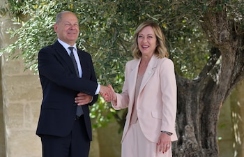 Meloni esperó a todos los líderes durante casi una hora parapetada bajo un sotechado puesto a las puertas del hotel para esquivar un sol de justicia, entre varios olivos y algunas fuentes de roca.