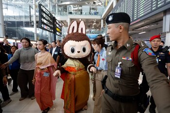 Las actividades de promoción comenzaron hoy con la llegada de un Labubu vestido con traje tradicional tailandés y escoltado por la policía al aeropuerto internacional de Suvarnabhumi en Bangkok y continuarán con paseos en los icónicos taxis tuktuk y la visita del Gran Palacio y centros comerciales, entre otros eventos.
