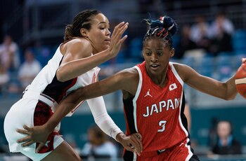 La baloncestista del equipo japonés Stephanie Mawuli ha aprovechado las trenzas de raíz para incluir en ellas extensiones y cintas con los colores de la bandera francesa: rojo, blanco y azul, que después se recogió en un moño.