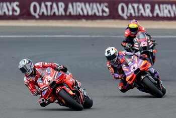 Por delante, 'Pecco' Bagnaia aguantó el tipo frente a los ataques de Martín y Espargaró, que lograron 'contactar' con él. Tanto el italiano como Martín se decidieron por el compuesto de neumático delantero intermedio, mientras que Aleix Espargaró optó por el duro, lo que al final de la carrera podría suponer una ventaja para el piloto de Granollers.