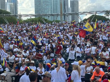 Al Bayfront Park, en el centro de Miami, llegaron millares de personas con banderas del país caribeño y pancartas que decían 'Fe y lucha' o 'Venezuela libre', en una explosión de apoyo entusiasta a la líder opositora María Corina Machado y a González Urrutia como el nuevo presidente electo.