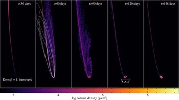 Simulaciones innovadoras han contribuido a un gran avance en la comprensión del dramático destino de las estrellas que se acercan demasiado a los agujeros negros en los centros de las galaxias. Un equipo internacional de astrofísicos ha capturado el complejo proceso de cómo estas estrellas son destrozadas y consumidas por los agujeros negros, proporcionando nuevos conocimientos sobre las misteriosas emisiones ópticas y ultravioleta observadas durante estos eventos catastróficos. "Esta es la primera simulación autoconsistente de una estrella que es desgarrada por mareas por un agujero negro supermasivo, seguida de la evolución de los escombros resultantes en el transcurso de un año", explica Daniel Price, profesor de la Escuela de Física y Astronomía en la Universidad de Monash, que dirigió el estudio. "Nuestras simulaciones proporcionan una nueva perspectiva sobre los momentos finales de las estrellas en las proximidades de los agujeros negros supermasivos", dijo. "Al capturar la evolución completa de los escombros, podemos intentar conectar las simulaciones con el creciente número de eventos de destrucción de estrellas observados mediante sondeos con telescopios" El estudio, publicado en The Astrophysical Journal Letters, abre nuevas vías para la investigación del comportamiento de la materia en campos gravitacionales extremos y los ciclos de vida de las estrellas y los agujeros negros. Cuando una estrella pasa demasiado cerca de un agujero negro supermasivo, las intensas fuerzas gravitacionales lo desmembran en un proceso conocido como evento de disrupción de marea (TDE). Los escombros de la estrella forman una corriente que finalmente alimenta al agujero negro. Los escombros de la estrella forman un disco giratorio alrededor del agujero negro, que emite una radiación intensa a través del espectro electromagnético. Sin embargo, muchos aspectos de los TDE siguen siendo poco conocidos. Las nuevas simulaciones muestran que estos desechos forman una burbuja asimétrica alrededor del agujero negro, reprocesando la energía y produciendo las curvas de luz observadas con temperaturas más bajas, luminosidades más débiles y velocidades de gas de 10.000 a 20.000 km/s. "El estudio ayuda a explicar varias propiedades desconcertantes de los TDE observados", dijo el profesor Price. "Una buena analogía es el cuerpo humano: cuando comemos el almuerzo, nuestra temperatura corporal no cambia mucho. Esto se debe a que reprocesamos la energía del almuerzo en longitudes de onda infrarrojas. "Un TDE es similar, en la mayoría de los casos no vemos el estómago del agujero negro comiendo gas, porque está sofocado por material que reemite en longitudes de onda ópticas. Nuestras simulaciones muestran cómo se produce esta asfixia".