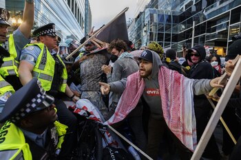 La Policía de Estados Unidos y manifestantes propalestinos se han enfrentado este martes por la noche frente al Consulado israelí en Chicago, donde se está celebrando la Convención Nacional Demócrata, en la que se elegirá a Kamala Harris y a Tim Walz como candidatos a presidenta y vicepresidente del partido de cara a las elecciones presidenciales que se celebrarán en noviembre. Un equipo de televisión de CNN ha observado que los agentes y los manifestantes se han empujado y dado codazos, a pesar de la instalación de una nueva valla. Los presentes han coreado 'Palestina libre' al paso de diferentes líderes políticos en las proximidades mientras protestaban por la gestión de la Administración estadounidense respecto de la guerra en la Franja de Gaza. El Consulado israelí ha afirmado estar "consternado por la violencia durante la protesta" frente a sus oficinas: "Esto es todo menos pacífico y completamente contradictorio con el espíritu de la convención. Esta minoría vocal no representa a la vasta mayoría bipartidista de estadounidenses que se mantienen firmes en apoyo a Israel". La legación diplomática ha señalado que ha sido "increíblemente reconfortante ver a muchos estadounidenses contrarrestar este odio frente" a su oficina, "haciendo eco del fuerte vínculo entre Estados Unidos e Israel". "Estamos más que decepcionados por el apoyo constante que el alcalde ha estado brindando a las protestas contra Israel en Chicago, y su continuo desprecio por la gran comunidad pro israelí y judía de la ciudad", ha agregado. "Por último, estamos agradecidos a todos los agentes de la ley que están protegiendo la ciudad durante la Convención Nacional Demócrata. Aplaudimos su autosacrificio y las incontables horas de trabajo para garantizar la seguridad de todos los habitantes de Chicago", ha concluido el consultado, a través de un comunicado publicado en su perfil de la red social X.