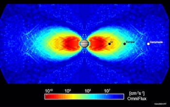 Los científicos de la misión Juno de la NASA han desarrollado el primer mapa de radiación tridimensional completo del sistema de Júpiter. Además de caracterizar la intensidad de las partículas de alta energía cerca de la órbita de la luna helada Europa, el mapa muestra cómo el entorno de radiación está esculpido por las lunas más pequeñas que orbitan cerca de los anillos de Júpiter. El trabajo se basa en datos recopilados por el instrumento ASC (Advanced Stellar Compass) de Juno, que fue diseñada y construida por la Universidad Técnica de Dinamarca, y la Unidad de Referencia Estelar (SRU) de la nave espacial, que fue construida por Leonardo SpA en Florencia, Italia. Los dos conjuntos de datos se complementan entre sí, ayudando a los científicos de Juno a caracterizar el entorno de radiación a diferentes energías. Tanto la ASC como la SRU son cámaras de poca luz diseñadas para ayudar con la navegación en el espacio profundo. Este tipo de instrumentos se encuentran en casi todas las naves espaciales. Pero para lograr que funcionen como detectores de radiación, el equipo científico de Juno tuvo que mirar las cámaras desde una perspectiva completamente nueva. Scott Bolton, investigador principal de Juno del Southwest Research Institute (SwRI), declaró en un comunicado: "Este es el primer mapa detallado de radiación de la región a estas energías más altas, lo que es un paso importante para comprender cómo funciona el entorno de radiación de Júpiter. Esto ayudará a planificar las observaciones para la próxima generación de misiones al sistema joviano". El ASC de Juno, que consta de cuatro cámaras estelares en el brazo del magnetómetro de la nave espacial, toma imágenes de las estrellas para determinar la orientación de la nave espacial en el espacio, lo que es vital para el éxito del experimento del campo magnético de la misión. Pero el instrumento también ha demostrado ser un valioso detector de flujos de partículas de alta energía en la magnetosfera de Júpiter. Las cámaras registran la "radiación dura", o radiación ionizante que impacta a una nave espacial con suficiente energía para atravesar el blindaje del ASC. "Cada cuarto de segundo, el ASC toma una imagen de las estrellas", dijo el científico de Juno John Leif Jorgensen de la Universidad Técnica de Dinamarca. "Los electrones muy energéticos que atraviesan su blindaje dejan una señal reveladora en nuestras imágenes que se parece al rastro de una luciérnaga. El instrumento está programado para contar el número de estas luciérnagas, lo que nos da un cálculo preciso de la cantidad de radiación". Debido a la órbita siempre cambiante de Juno, la nave espacial ha atravesado prácticamente todas las regiones del espacio cerca de Júpiter. Los datos del ASC sugieren que hay más radiación de muy alta energía en relación con la radiación de menor energía cerca de la órbita de Europa de lo que se creía anteriormente. Los datos también confirman que hay más electrones de alta energía en el lado de Europa que mira hacia su dirección de movimiento orbital que en el lado de la cola de la luna. Esto se debe a que la mayoría de los electrones de la magnetosfera de Júpiter alcanzan a Europa por detrás debido a la rotación del planeta, mientras que los electrones de muy alta energía se desplazan hacia atrás, casi como peces que nadan río arriba, y chocan contra el lado frontal de Europa. Los datos de radiación joviana no son la primera contribución científica del ASC a la misión. Incluso antes de llegar a Júpiter, los datos del ASC se utilizaron para determinar una medición del polvo interestelar que impactó a Juno. El generador de imágenes también descubrió un cometa previamente inexplorado utilizando la misma técnica de detección de polvo, distinguiendo pequeños trozos de la nave espacial expulsados ??por el polvo microscópico que impactó a Juno a alta velocidad. Al igual que el ASC de Juno, el SRU se ha utilizado como detector de radiación y generador de imágenes con poca luz. Los datos de ambos instrumentos indican que, al igual que Europa, las pequeñas "lunas pastoras" que orbitan dentro o cerca del borde de los anillos de Júpiter (y ayudan a mantener la forma de los anillos) también parecen interactuar con el entorno de radiación del planeta. Cuando la nave espacial vuela sobre líneas de campo magnético conectadas a lunas de anillos o polvo denso, el recuento de radiación tanto en el ASC como en el SRU cae precipitadamente. El SRU también está recopilando imágenes poco comunes de los anillos en condiciones de poca luz desde el punto de observación único de Juno.