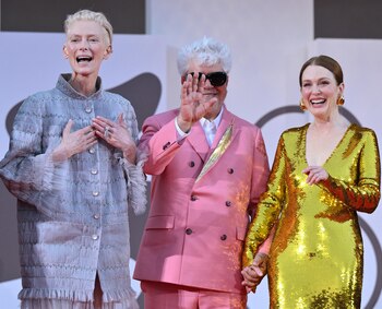 El estreno oficial también contó con la presencia del ministro de Cultura de España, Ernest Urtasun, que recibió a Almodóvar, Swinton y Moore a las puertas del Palacio del Cine, posando ante las cámaras después con ellos y con el director de la Mostra, Alberto Barbera.