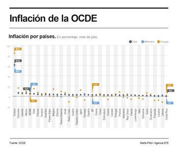 Por lo que respecta al cuarto país latinoamericano de la OCDE, Costa Rica, su inflación se mantuvo sin cambios en el 0 %. Es el único con una inflación nula y no hay ninguno con negativa.