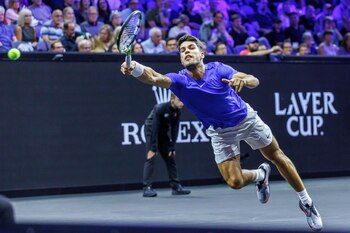 El tenista español Carlos Alcaraz ha puesto el empate para Europa (4-4) en la Laver Cup, el torneo asociado a la ATP que enfrenta a un combinado del Viejo Continente con el del resto del mundo y que se disputa en el Uber Arena de Berlín, después de firmar este sábado la victoria en su encuentro ante el estadounidense Ben Shelton (6-4, 6-4). Después de que el también norteamericano Frances Tiafoe derrotase al ruso Daniil Medvedev (3-6, 6-4, 10-5) para poner por delante al equipo mundial (4-2), capitaneado por John McEnroe, el murciano saltó a la pista dispuesto a olvidar su tropiezo del viernes ante el dobles junto al alemán Alexander Zverev frente a la dupla estadounidense formada por Taylor Fritz y Ben Shelton. Frente a la atenta mirada del suizo Roger Federer, el número tres del mundo, campeón de Roland Garros y Wimbledon esta temporada, necesitó una hora y 43 minutos para doblegar a Shelton, al que ya había ganado en 2023 en el ATP Masters 1.000 de Canadá. El de El Palmar estuvo atento en momento vitales para salvar las cinco bolas de 'break' a las que se enfrentó, y rompió dos veces el servicio de su adversario, una en cada set, para endosar al estadounidense su primera derrota en la historia de la competición. Este mismo sábado, se pondrán en juego cuatro puntos más con los partidos entre Alexander Zverev y el estadounidense Taylor Fritz y entre la pareja formada por el noruego Casper Ruud y el griego Stefanos Tsitsipas y la dupla integrada por Shelton y el chileno Alejandro Tabilo. El primer equipo que llegue a 13 puntos ganará la Laver Cup.