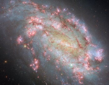 Diez imágenes del telescopio espacial Hubble, cada una filtrada para captar luz de una longitud de onda o rango de longitudes de onda específico, dan como resultado esta nueva imagen de NGC 1559. Se trata de una galaxia espiral barrada situada en la constelación de Retículo, aproximadamente a 35 millones de años luz de la Tierra. La brillante luz captada en la imagen ofrece una gran cantidad de información, según la NASA, que opera Hubble junto a la ESA. Las imágenes abarcan la sensibilidad del Hubble a la luz, desde el ultravioleta hasta la luz visible y el espectro cercano al infrarrojo. Captar un rango tan amplio de longitudes de onda permite a los astrónomos estudiar información sobre muchos procesos astrofísicos diferentes en la galaxia: un ejemplo notable es el filtro rojo de 656 nanómetros utilizado aquí. Los átomos de hidrógeno ionizado emiten luz en esta longitud de onda particular, llamada emisión H-alfa. Las nuevas estrellas que se forman en una nube molecular, compuesta principalmente de gas hidrógeno, emiten grandes cantidades de luz ultravioleta que la nube absorbe, ionizando el gas hidrógeno y haciendo que brille con luz H-alfa. El uso de los filtros del Hubble para detectar únicamente la luz H-alfa proporciona una forma fiable de detectar áreas de formación estelar (denominadas regiones H II). Estas regiones son visibles en esta imagen como manchas rojas y rosadas brillantes que llenan los brazos espirales de NGC 1559. Estas diez imágenes proceden de seis programas de observación del Hubble diferentes, que abarcan desde 2009 hasta 2024. Equipos de astrónomos de todo el mundo propusieron estos programas con una variedad de objetivos científicos, que van desde el estudio del gas ionizado y la formación estelar hasta el seguimiento de una supernova o el seguimiento de estrellas variables como contribución al cálculo de la constante de Hubble. Los datos de todas estas observaciones se encuentran en el archivo del Hubble. Además de las observaciones del Hubble, los astrónomos están utilizando el telescopio espacial James Webb de la NASA/ESA/CSA para seguir investigando esta galaxia. Una imagen del Webb de febrero de 2024 mostró la galaxia en luz infrarroja cercana y media.