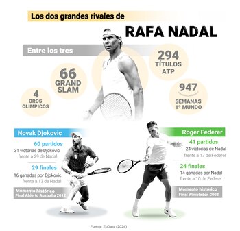 Ni Roger Federer, retirado en 2022, ni Novak Djokovic, con Serbia eliminada de las finales de la Copa Davis, tendrán opción de jugar ante Rafa Nadal en su último torneo como profesional. Sin embargo, ambos han marcado y han sido protagonistas de los más de 20 años de carrera deportiva del 14 veces campeón de Roland Garros. Tanto que seguramente no se entendería la vida deportiva de Rafa Nadal sin el de Basilea y el de Belgrado, que han conquistado 66 'grandes'.