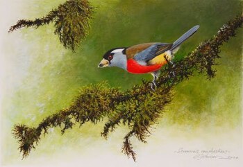 La selección presenta, a través de doce obras en acrílico y diez acuarelas, la belleza de las aves del Chocó andino y alerta de las amenazas que ponen en peligro estos bosques tropicales, puntos calientes de biodiversidad del planeta.