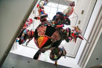 'Mary Poppins' es una gigantesca escultura colgante compuesta por tejidos artesanales multicolores, brocados, festones, borlas y botones. Con una longitud de siete metros, sus seis tentáculos se despliegan en el patio del Museo Mohamed VI de Arte Contemporáneo, que acoge la exposición.