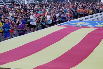 Minutos antes de la salida, por la megafonía se ha hecho público un mensaje de agradecimiento a los 35.0000 participantes por haber acudido a la prueba en una circunstancias tan complicadas como las que ha vivido Valencia esta semanas y se ha escuchado el himno regional de la Comunitat Valenciana en un enorme silencio. Así está previsto que se repita en las otras ocho salidas