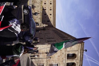Acampada por Palestina se ha concentrado, en la mañana de hoy, en San Millán de la Cogolla, de forma pacífica y silenciosa coincidiendo con la salida de la Reina Doña Letizia, que había acudido a presidir la clausura de la decimoséptima edición del Seminario Internacional de Lengua y Periodismo.