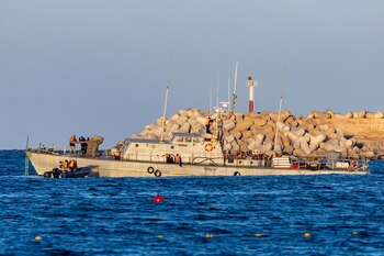 El trasiego de lanchas y operarios marroquíes fue constante durante toda la mañana de este viernes en la zona, donde también había una embarcación remolcadora del puerto marroquí de Nador unida a la patrullera por una cuerda para tratar de desencallarla.