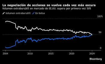 Por primera vez desde que se tiene registro, la mayoría de las operaciones en acciones estadounidenses se realiza de forma sistemática fuera de las bolsas del país, según datos recopilados por Bloomberg.