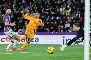 Valladolid, 25 ene (EFE).- El delantero del Real Madrid, Kylian Mbappé, suma y sigue añadiendo goles a su casillero, en una primera mitad en la que el Real Valladolid plantó cara y se defendió para impedir el dominio visitante.