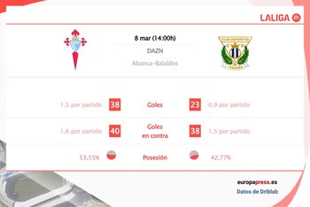 De media, el Celta de Vigo ha encajado 1,5 goles y 10 disparos por partido ante los 1,5 goles y 7,3 disparos que recibe el Leganés.