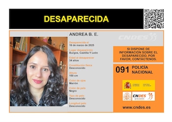 Según informan en su perfil de la red 'X' la asociación (@sosdesaparecido) y el Centro Nacional de Desaparecidos (@cndes_oficial), se busca a una mujer de 35 años, Andrea B.E.