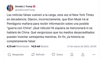 Pero Trump salió al cruce de manera más terminante: “Las noticias falsas vuelven a la carga, esta vez el decadente New York Times. Dijeron, incorrectamente, que Elon Musk irá al Pentágono mañana para recibir información sobre una posible ‘guerra con China’. ¡Qué ridículo! Ni siquiera se mencionará ni se hablará de China (...) En fin, ¡la historia es completamente falsa!“, aseguró.