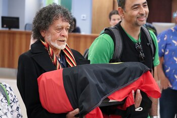 Representantes de las autoridades aborígenes de este jurisdicción portaron los restos en una urna envuelta con la bandera que representa a los pueblos originarios de esta nación austral.