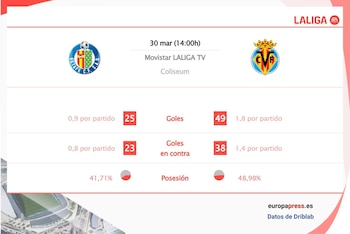 De media, el Getafe ha recibido 0,8 goles y 10,1 tiros por partido, por los 1,4 goles y 13,5 remates que recibe el Villarreal.