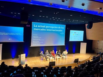 La mesa estaba formada por el director general de Turespaña, Miguel Sanz; la Agència Catalana de Turisme, Arantxa Calvera, la directora general de Barcelona Global, Mercè Conesa, y el jefe de la corresponsalía de Bloomberg en España, Rodrigo Orihuela.