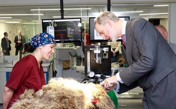 A continuación, el Rey ha comenzado su visita acompañado por la decana de la Facultad de Veterinaria de la Universidad Alfonso X el Sabio, mientras profesores y estudiantes se encontraban realizando actividades en los distintos espacios de esta institución, observando diferentes prácticas clínicas y visitando un quirófano virtual.