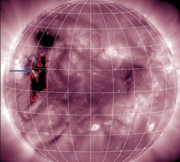 En la imagen ultravioleta extrema del Observatorio de Dinámica Solar (SDO) de arriba, la flecha azul marca un pequeño punto brillante ubicado en el borde de un agujero coronal (delineado en rojo) que fue la fuente del fenómeno.