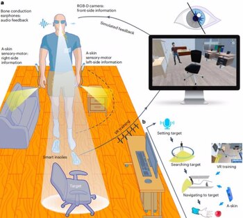 Equipado con una cámara para capturar datos visuales, el sistema utiliza IA para analizar el entorno, detectar obstáculos y objetivos clave, y luego envía instrucciones a través de auriculares de conducción ósea y parches cutáneos electrónicos de muñeca.