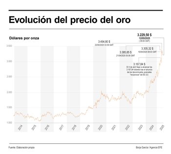 Con la caída de hoy, el oro se aleja de los máximos históricos que alcanzó el pasado 22 de abril, cuando superó, por primera vez en su historia, los 3.500 dólares la onza. En concreto, alcanzó los 3.500,10 dólares.