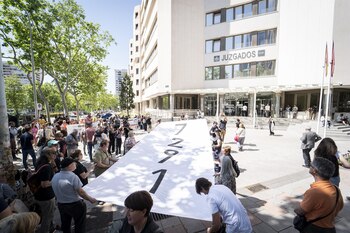 Decenas de personas convocadas por las asociaciones '7.291: Verdad y Justicia y Marea de Residencias' se han concentrado este lunes frente a los juzgados de Plaza Castilla para pedir "justicia por las víctimas en residencias de mayores durante la primera ola de Covid-19" coincidiendo con la citación.