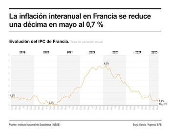 París, 27 may (EFECOM).- La tasa de inflación interanual en Francia se ha reducido una décima este mes de mayo, gracias a los servicios, a la energía y a los alimentos, para quedarse en el 0,7 %, el nivel más bajo desde el primer trimestre de 2021.
