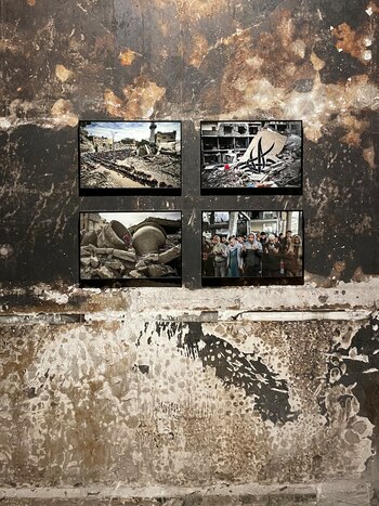 Así, como si surgieran de entre las propias cenizas de la estructura, Khaled lleva a este espacio una colección de unas 30 imágenes que son un testimonio vivo del horror del pueblo palestino.