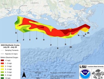 Científicos de la Universidad Estatal de Luisiana y el Consorcio Marino de las Universidades de Luisiana (LUMCON) lideraron el estudio anual de la zona muerta del 20 al 25 de julio a bordo del buque de investigación Pelican de LUMCON. Esta medición anual es una métrica clave que fundamenta los esfuerzos colectivos del Grupo de Trabajo sobre Hipoxia del Río Misisipi/Golfo de México, que se ha fijado el objetivo a largo plazo de reducir la extensión promedio de la zona muerta en cinco años a menos de 3.000 kilómetros cuadrados para 2035.