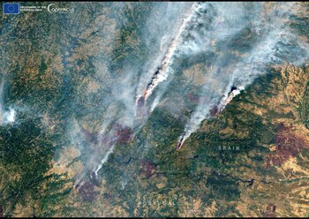 Copernicus ha elegido como imagen del día una foto tomada el 16 de agosto por el Sentinel-2 que muestra densas columnas de humo que se elevan desde los incendios activos cerca de Ourense (Galicia).