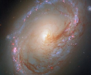 El hidrógeno ionizado rastrea la formación estelar en curso, revelando regiones donde estrellas jóvenes y calientes ionizan el gas. El nitrógeno ionizado ayuda a los astrónomos a determinar la tasa de formación estelar y las propiedades del gas entre las estrellas, mientras que la combinación de los dos gases ionizados ayuda a los investigadores a determinar si la galaxia es una galaxia con brotes de formación estelar o una con un núcleo galáctico activo. Las burbujas de gas rosa en esta imagen rodean estrellas jóvenes, calientes y masivas, iluminando un anillo de formación estelar en las afueras de la galaxia.
